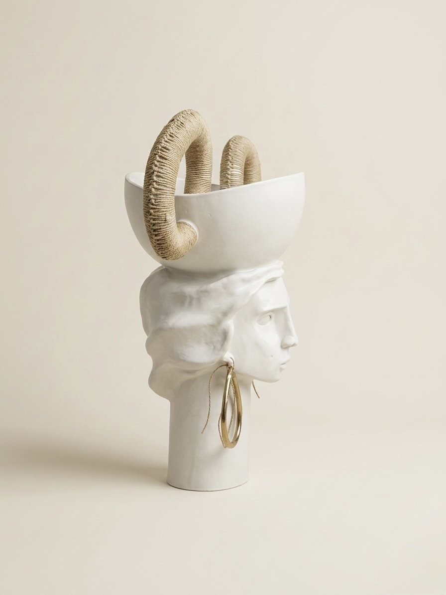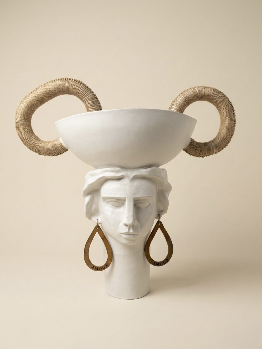 Description : Sculpture en grès émaillé blanc satiné représentant un visage de déesse antique aux traits apaisés, les yeux mi-clos. La coupe qui couronne la tête est flanquée de deux anses recouvertes de corde de lin enroulée. Aux oreilles, deux boucles en bronze doré poli miroir gravées du mot "AMOUR" — bijou offert à la figure divine, entre offrande et déclaration.